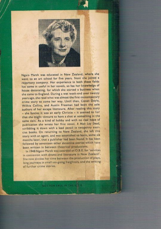 Herdruk in de Penguin reeks in 1955. Pocket. 287 pagina's. Het boekblok (los in de kaft) is nog in vrij aardige staat; alleen een beetje scheef door het lezen. De kaft heeft een zwaar leven gehad, dat nog is verergerd door het gebruik van plakband. Voor wie van de detectives in de Engelse taal van Ngaio Marsh houdt, is dit een unieke aanbieding. Dikte 1,3 cm. Gewicht 162 gram. Verzendkosten vanaf € 3,95. Prijs € 2,50.