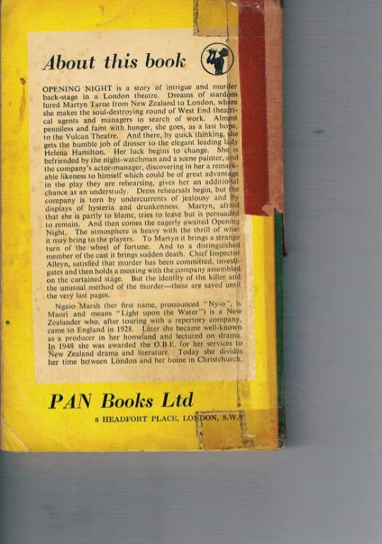 Uitg. Pan Books. Eerste publicatie van dit boek in 1951. Eerste druk in deze reeks in 1956. Pocket. 206 pagina's. Het boekblok is slechts een klein beetje scheef en zit nog grotendeels vast. De kaft heeft een beetje gebruikssporen, maar wordt ontsierd door het ge(mis-)bruik van plakband. Voor wie van de detectives in de Engelse taal van Ngaio Marsh houdt, is dit een unieke aanbieding. Dikte 1 cm. Gewicht 119 gram. Verzendkosten vanaf € 3,95. Prijs € 2,50.