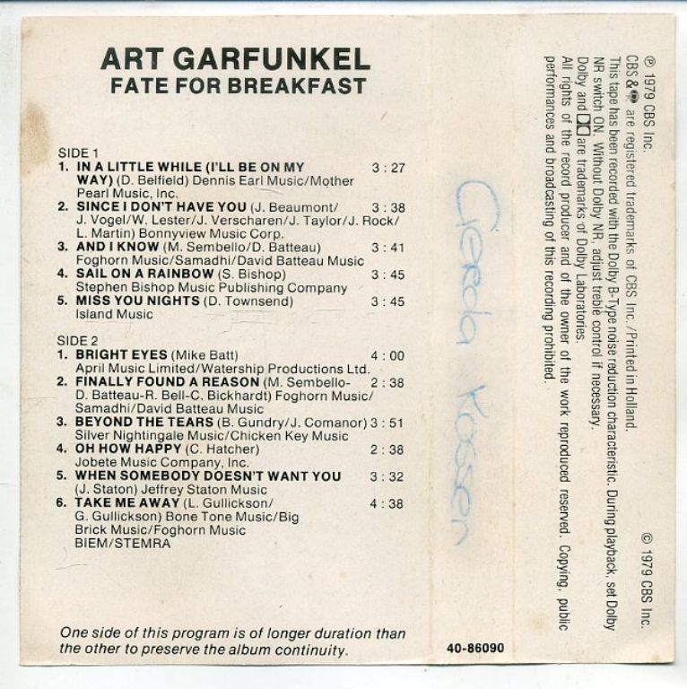 Art Garfunkel – Fate For Breakfast 11 nrs cassette 1979 ZGAN