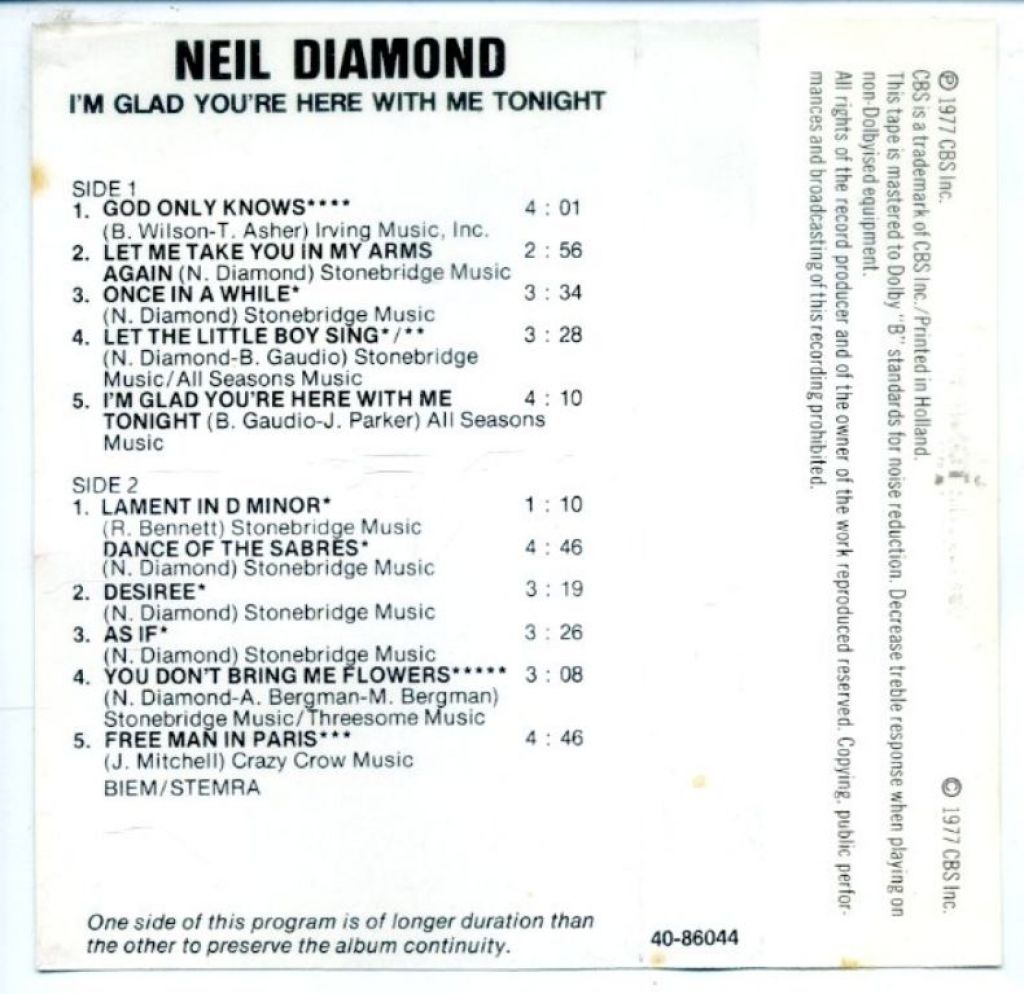 Neil Diamond I’m Glad You’re Here With Me Tonight 10 nrs cassette 1977 ZGAN