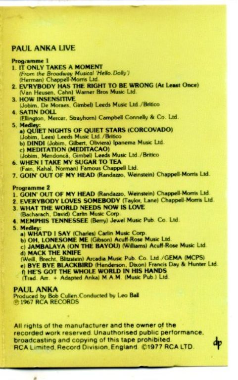 2)Paul Anka – Paul Anka Live 12 nrs cassette 1977 ZGAN