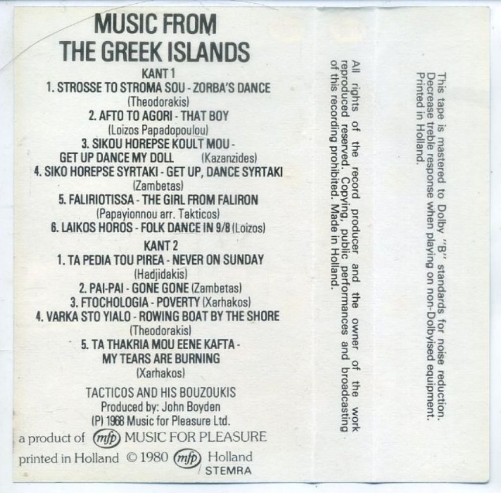 Music From The Greek Islands 11 nrs cassette 1980 ZGAN