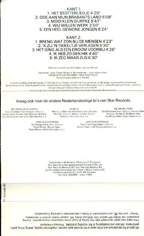 Jantje Koopmans De koning van het Nederlandstalige levenslied 10 nrs cassette ZGAN