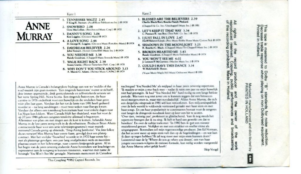 Anne Murray – Grootste Hits 15 nrs cassette 1982 ZGAN