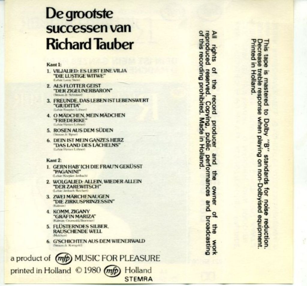 Richard Tauber De Grootste Successen 12 nrs cassette 1980 ZGAN