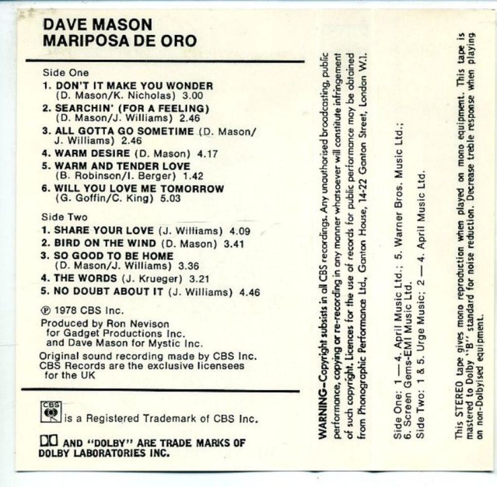 1) Dave Mason – Mariposa De Oro 11 nrs cassette 1978 ZGAN