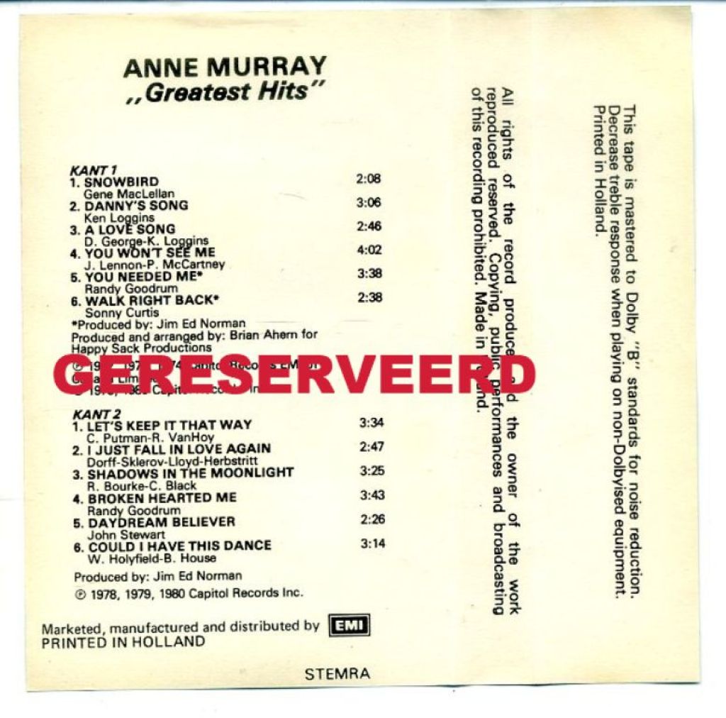 VERKOCHT 2) Anne Murray Greatest Hits 12 nrs cassette 1980 12 nrs Capitol Records 1A 262-86229 1980