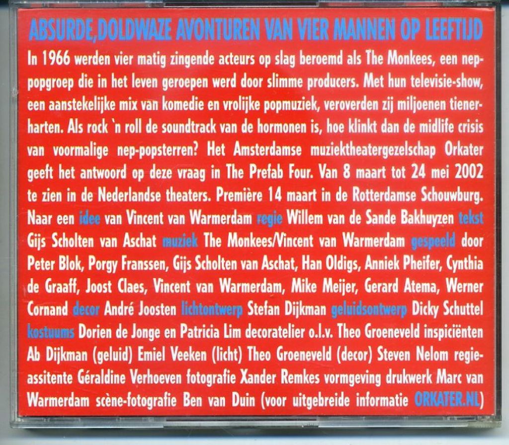 The Prefab Four is geschreven door Gijs Scholten van Aschat en gaat over de zoektocht naar eeuwige roem van vier voormalige nep-popsterren op leeftijd. Het stuk gaat ook over hun muziek, onderlinge naijver, gezamenlijke successen en mislukkingen. De muziek is van The Monkees, de karakters en de gebeurtenissen zijn fictief. Regie was in handen van Willem van de Sande Bakhuyzen, de rollen werden onder andere gespeeld door Peter Blok, Porgy Franssen, Han Oldigs, Gijs Scholten van Sschat en Vincent van Warmerdam. The Prefab Four kreeg een eindnominatie voor de NRC toneelpublieksprijs 2002.