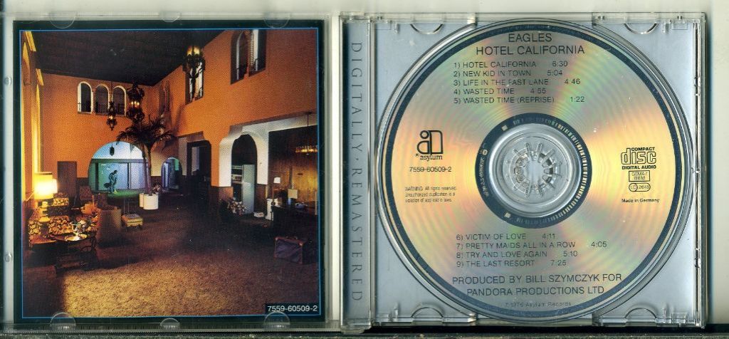 EAGLES – Hotel California 9 nrs CD ZGAN Label: Asylum Records Cataloge: 103-2 – EUROPE 253 051 Opname: Stereo Format: CD Aantal nrs: 9 Uitgegeven: Made in EUROPE – W.-GERMANY Genre: Blues Rock, Country Rock, Classic ...
