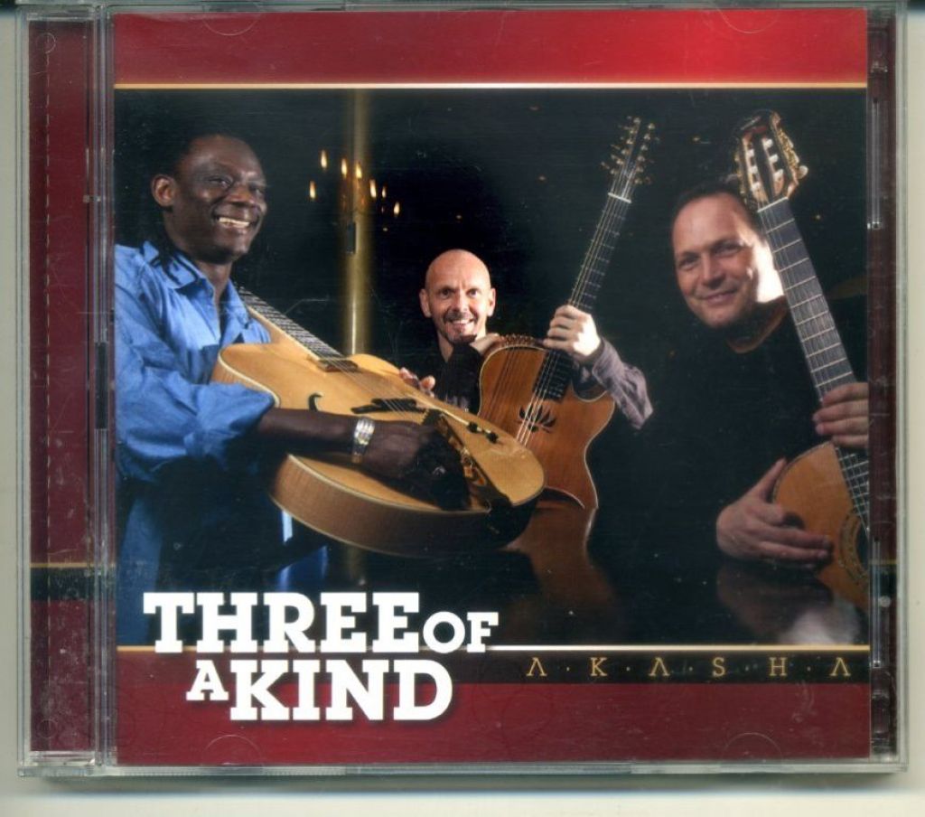 Akasha cd van gitaartrio bestaande uit Jan Kuiper, Stochelo Rosenberg en Zoumana Diarra. Uiteraard valt de naam van Stochelo hier direct op want die brengen wij normaal gesproken in verband met zijn eigen trio. Maar kennelijk is deze virtuoos ook bereid andere paden in te slaan en nu eens niet Gypsy Jazz te vertolken maar zich bezig te houden met de muziek van gitarist Jan Kuiper. Het trio heeft onder de naam “Three Of A Kind” het afgelopen jaar door Nederland getoerd met de muziek van deze cd. Het is een dubbel cd geworden met dik anderhalf uur virtuoos uitgevoerde gitaarklanken met zowat alle composities van Jan Kuiper himself en vanuit het hart gespeeld. Een aanrader voor gitaarliefhebbers.