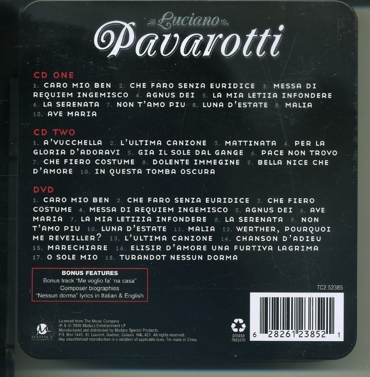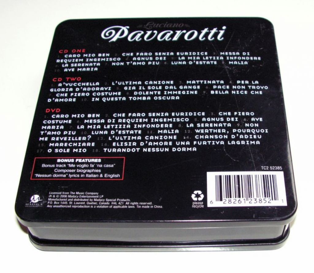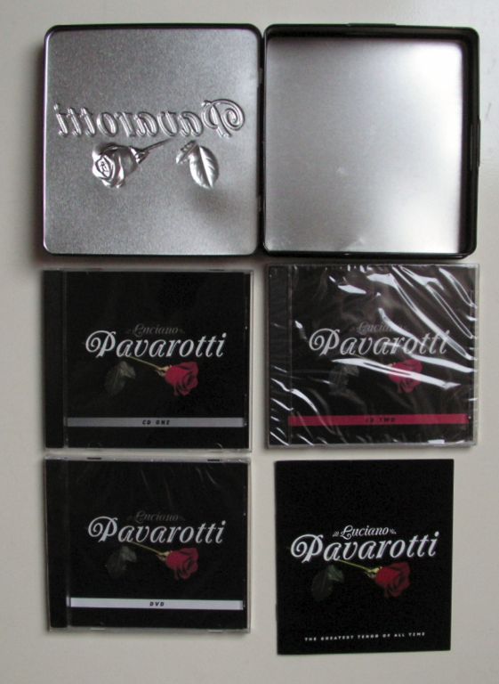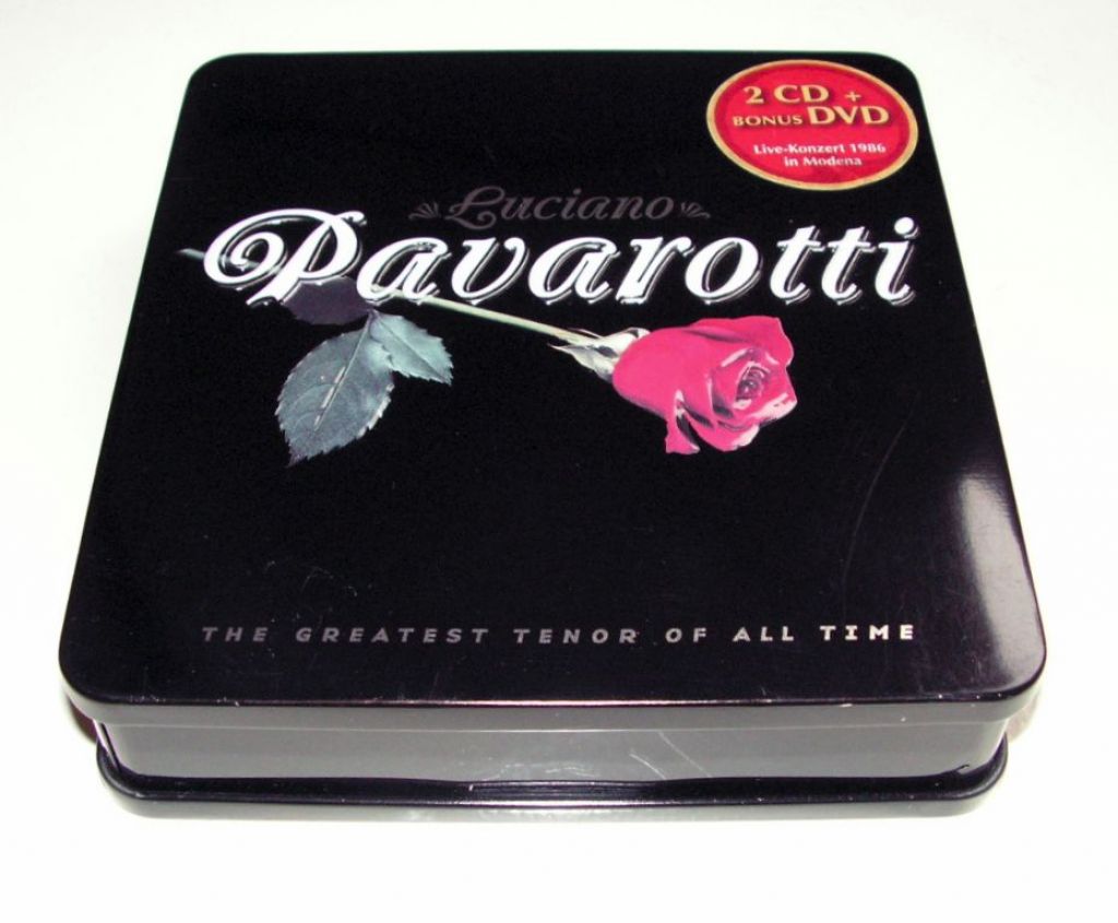 Luciano Pavarotti The Greatest Tenor of All Time 2 CDs+1DVD in blik ZGAN Live konzert 1986 in modena een prachtige tinbox met 2 CD's en een DVD waar het live concert in Modena in 1986 op staat.