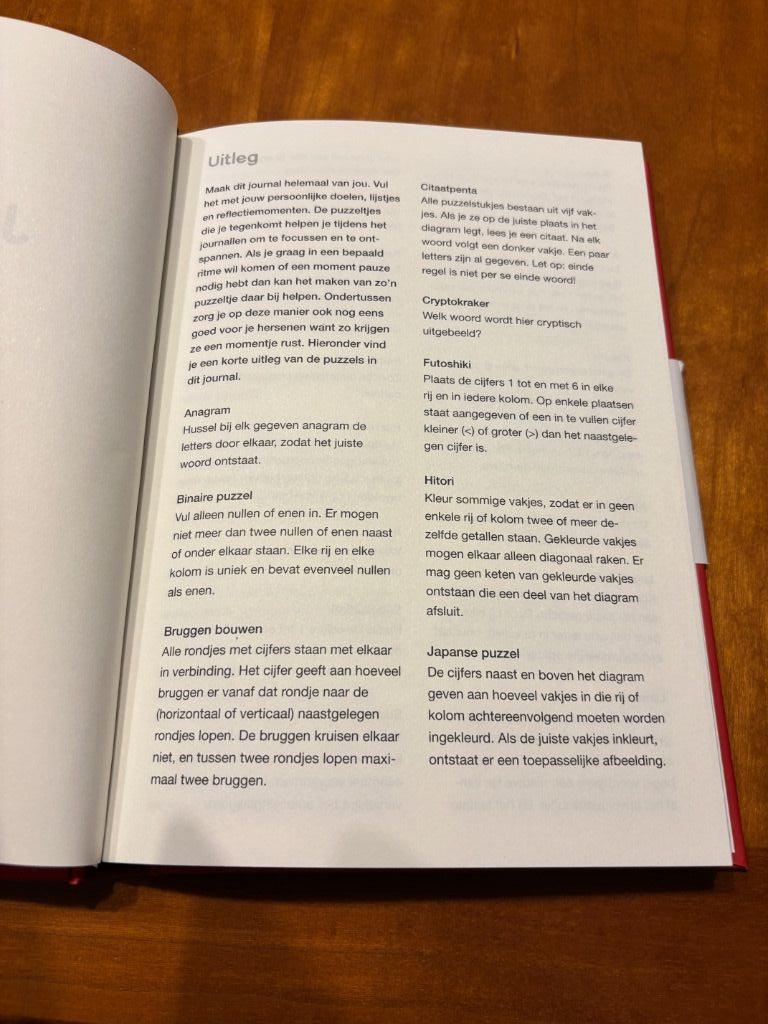 Dit journal bevat 160 pagina’s bullets, inspiratiepagina’s en natuurlijk puzzels. Van een paardensprong tot een sudoku en van een anagram tot een tectonic: dit journal is de manier om te ontspannen en zo tot een diepe focus te komen.