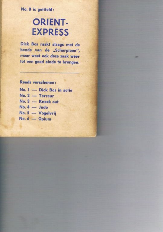 Uitg. Nooit Gedacht. 1963. Eerste druk in deze serie. In een vroegere serie heette dit deel “Dick Bos bedrogen”. Gebruikssporen o.a. enkele lichte kreukjes voor en achter. Verder in vrij goede staat. 192 blz. Dikte 1 cm. ...