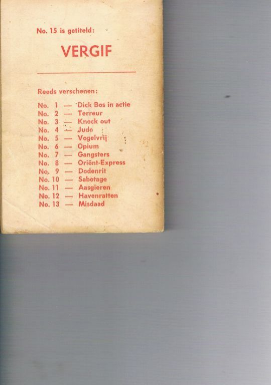 Uitg. Nooit Gedacht. 1963. Eerste druk in deze serie. In een vroegere serie heette dit deel “Dick Bos bedrogen”. Gebruikssporen o.a. enkele lichte kreukjes voor en achter. Verder in vrij goede staat. 192 blz. Dikte 1 cm. ...
