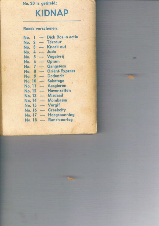 Uitg. Nooit Gedacht. 1961. Eerste druk in deze serie. In een vroegere serie heette dit deel Jiu-Jitsu. In dit deel treedt Maurice van Nieuwenhuizen op, naar wiens uiterlijk Dick Bos is getekend. Het boekje is in vrij goede staat, met als ...