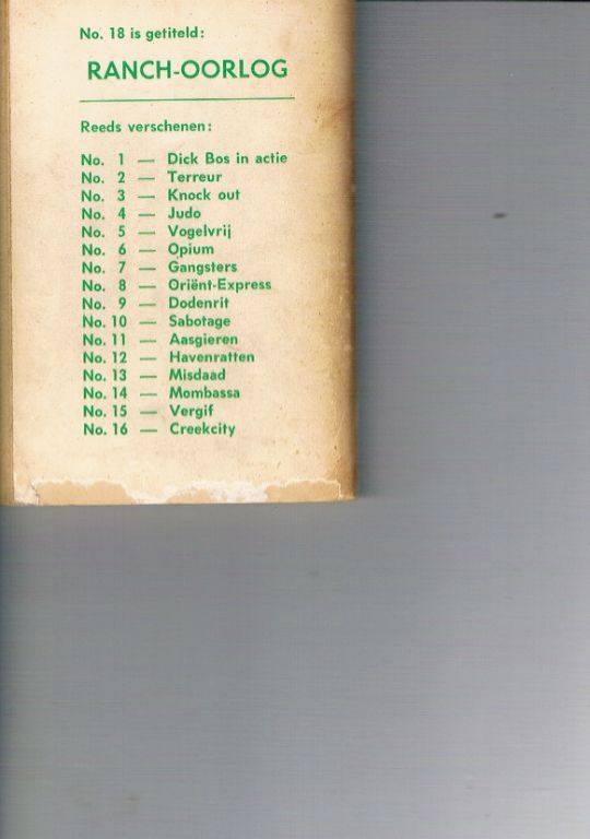 Uitg. Nooit Gedacht. 1963. Eerste druk in deze serie. In een vroegere serie heette dit deel Dick Bos bedrogen. Wat gebruikssporen o.a. wat verkleurd en plakbandresten over voor- en achterkaft. Boekblok verder vrij aardig. 192 blz. Dikte 1 ...