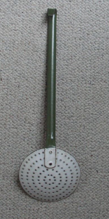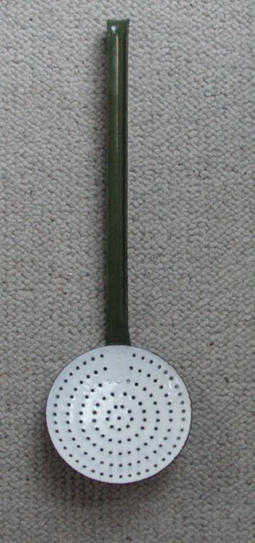 Emaille schuimspaan groen wit zeer mooie staat
