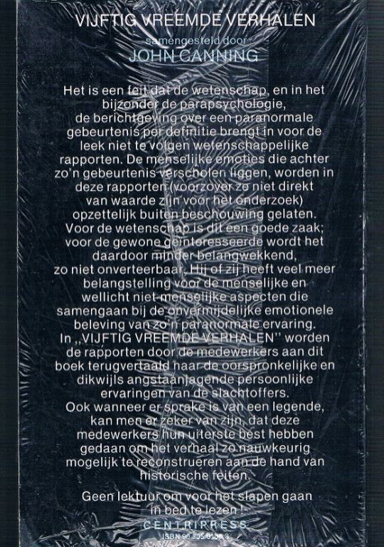 Het boek zit nog in de seal verpakking en is nog nieuw. Ik heb wat speurwerk moeten doen om nog wat gegevens te kunnen bemachtigen. Uitg. Centripress. Waarschijnlijk 1e druk 1980. Kennelijk wat bovennatuurlijke verhalen. Dikte 2,8 cm. Gewicht 446 gram. Verzendkosten vanaf € 4,50. Prijs € 12,50.