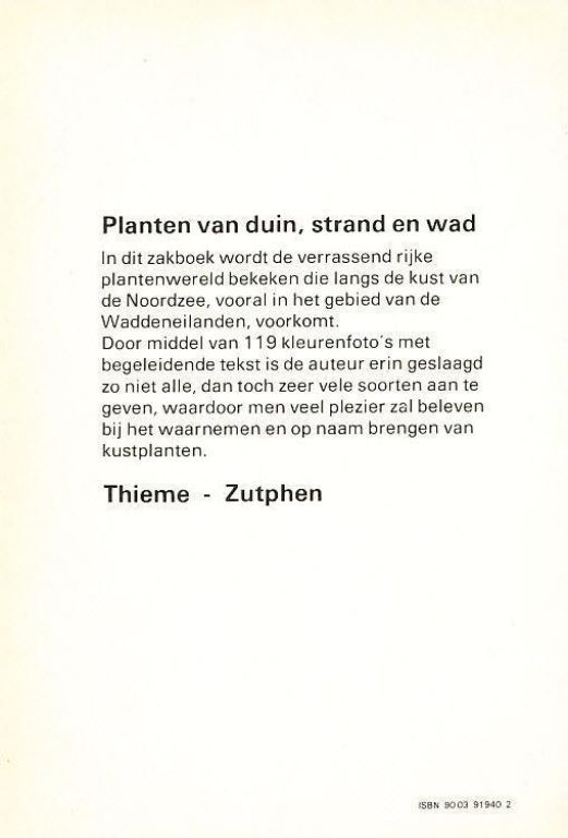 Door middel van 119 kleurenfoto's met begeleidende tekst is de auteur erin geslaagd zo niet alle, dan toch zeer vele soorten aan te geven, waardoor men veel plezier zaI beleven bij het waarnernen en op naam brengen van kustplanten.