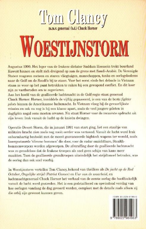 In Woestijnstorm vertellen Tom Clancy, bekend van thrillers als De jacht op Red October, Ongelijke strijd (Patriot Games) en Uur van de waarheid, en luchtmachtgeneraal Chuck Horner het verhaal van de eerste oorlog die hoofdzakelijk vanuit de lucht werd ges treden.