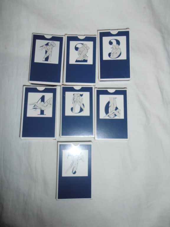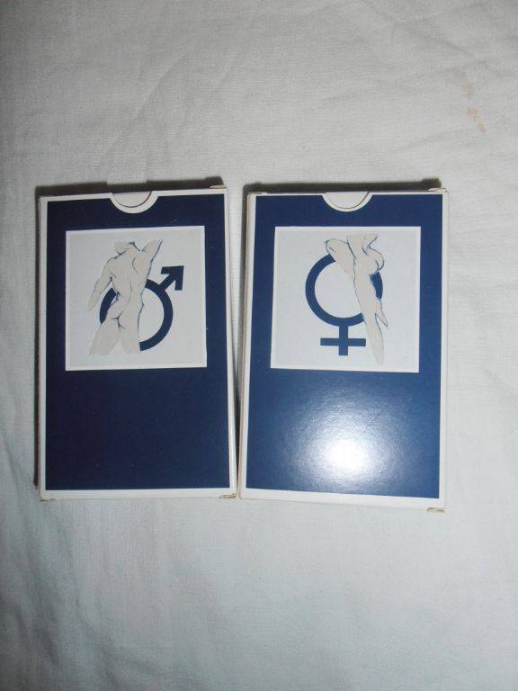 Het geheel bestaat uit: een opbergdoos, Spelregels, een boekje voor de man, een boekje voor de vrouw, een doosje kaarten voor de man, een doosje kaarten voor de vrouw, 7 doosjes liefdesscenario's (kaarten). Ik heb e.e.a. bekeken, maar niet nageteld. Zo op het oog is het spel in nieuwstaat, maar het kan zijn, dat het door een vorige eigenaar is gespeeld of bekeken. Op de doos is bovenop een lichte beschadiging te zien. Ook een hoekje heeft een plekje. Het spel is op de markt gebracht in België en gedrukt in Spanje in 1996 (21e druk).