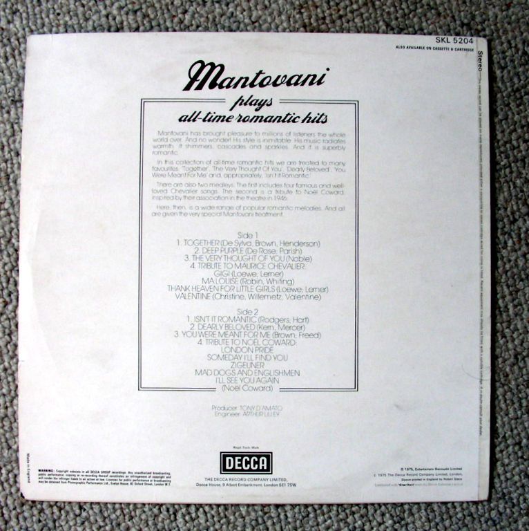 Mantovani Plays All-Time Romantic Hits 8 nrs LP 1975 ZGAN