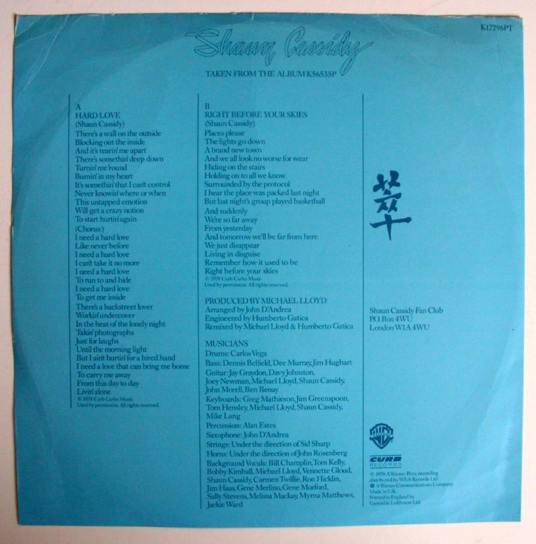 Shaun Cassidy - Hard Love 2 nrs 12” Maxi Single Picture Disc 1978