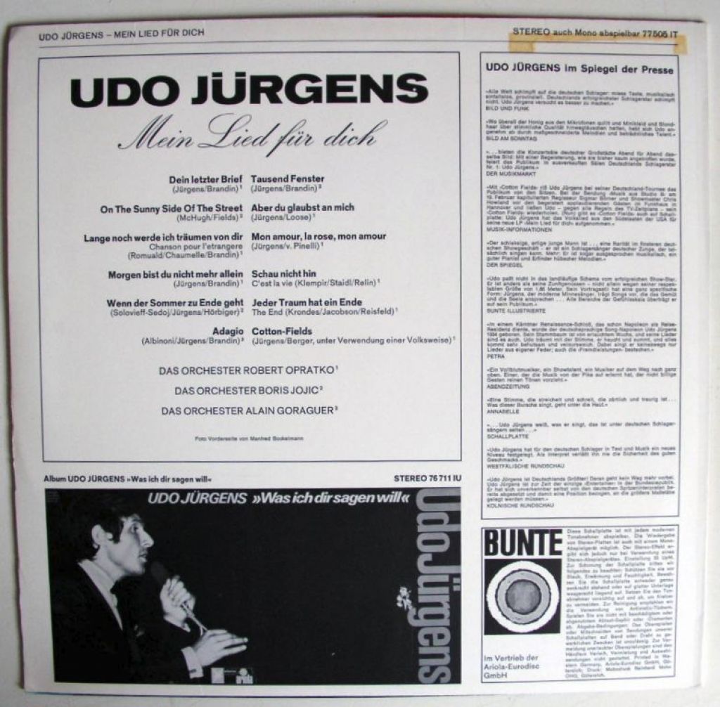 Udo Jürgens Mein Lied für dich 12 nrs lp 1968 mooie staat