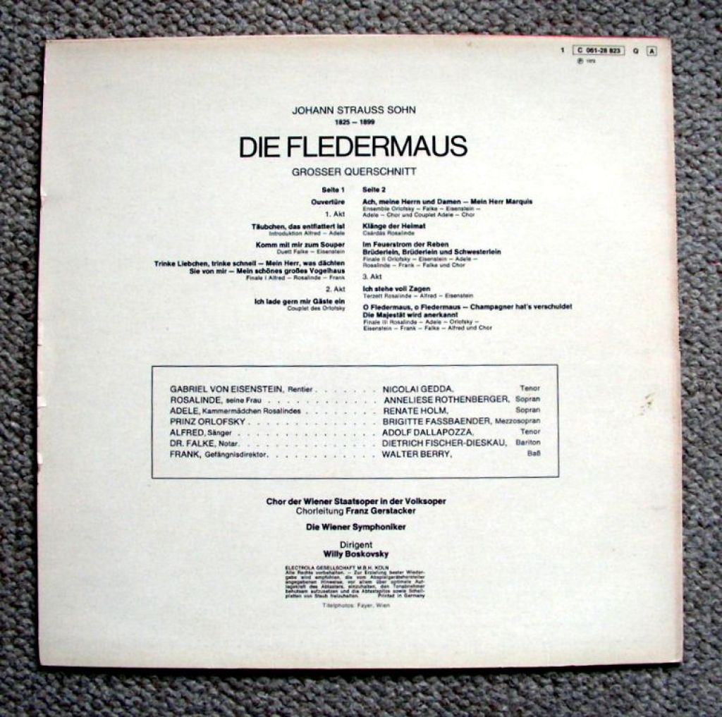 Johann Strauss, Anneliese Rothenberger, Dietrich Fischer-Dieskau, Nicolai Gedda, Renate Holm, Brigitte Fassbaender, Adolf Dallapozza, Walter Berry, Wiener Symphoniker, Dirigent Willi Boskovsky – Die Fledermaus (Grosser Querschnitt)