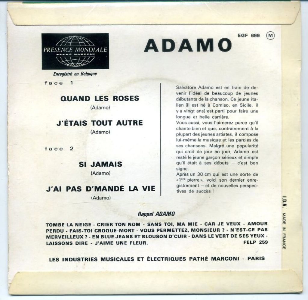 Adamo Quand Les Roses vinyl EP single 4 nrs 1964 zeer mooi
