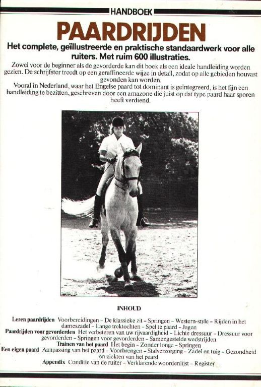 Vooral in Nederland, waar het Engelse paard tot dominant is geïntegreed, is het fijn een handleiding te bezitten, geschreven door een amazone die juist op dat type paard haar sporen heeft verdiend.
