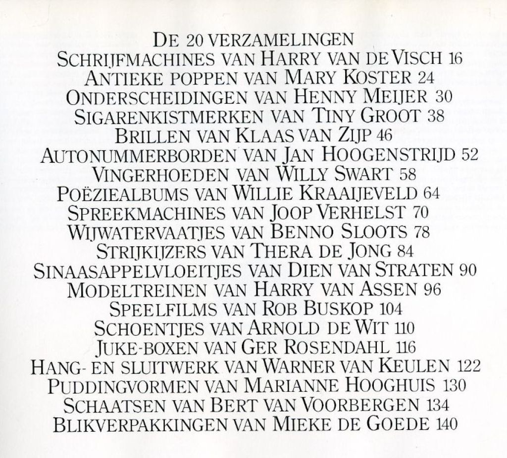 Twintig verzamelaars over hun hobby over o.a. SCHRIJFMACHINES ANTIEKE POPPEN ONDERSCHEIDINGEN SIGARENKISTMERKEN BRILLEN AUTONUMMERBORDEN VINGERHOEDEN POEZIEALBUMS SPREEKMACHINES WIJWATERVAATJES STRIJKIJZERS SINAASAPPELVLOEITJES MODELTREINEN SPEELFILMS SCHOENTJES JUKE BOXEN HANG- EN SLUITWERK PUDDINGVORMEN SCHAATSEN BLIKVERPAKKINGEN...