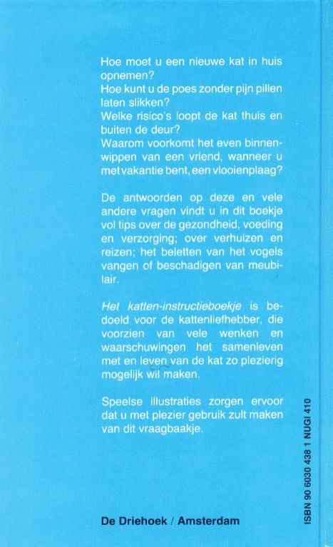Het katten-instructieboekje is bedoeld voor de kattenliefhebber, die voorzien van vele wenken en waarschuwingen het samenleven met en leven van de kat zo plezierig mogelijk wil maken.