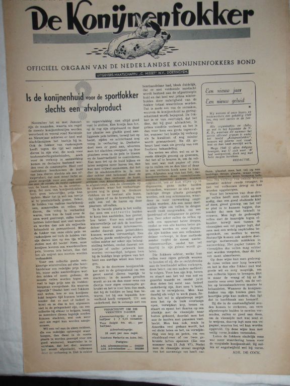Een 14-daags tijdschrift van de Nederlandse Konijnenfokkers Bond (nu in nieuwe spelling!) uitgegeven door C. Misset. Aanwezig is 1 – 4, 6 -26. Nr. 5 ontbreekt dus. Nr. 26 is van 14 december 1948. Naar verwachting zou het volgende nummer dus van 28 december moeten zijn. Kennelijk heeft men dit met het oog op de kerstdagen achterwege gelaten. Dit blijkt ook uit het feit, dat het volgende nummer verschijnt op 4 januari 1949 als nr.1 van de nieuwe jaargang.