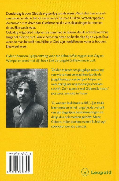 Als de schoolzwembus langs het pleintje rijdt, kun je hem zien zitten op het bankje bij de vijver.
