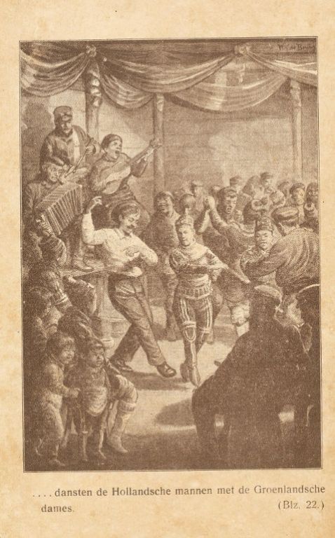 Op de muziek van een harmonika, een guitaar en een oude trom, door beoefenaars der schoone kunst, zoover die onder de schepelingen waren to vinden bespeeld, dansten de Hollandsche mannen met de Groenlandsche dames, of ze elkander al jaren gekend hadden.