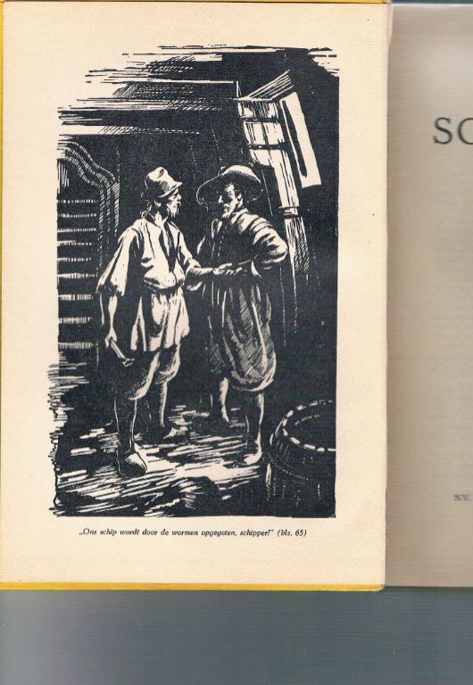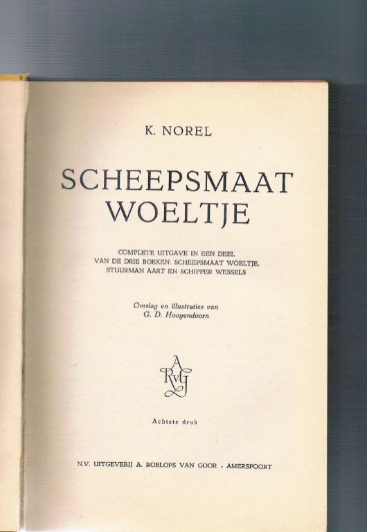 Uitg. A. Roelofs van Goor. 8e druk. Geschat jaren '50/'60. Gebonden. 436 pagina's. Dikte 3,5 cm. Gewicht 683 gram. De rugband heeft in de loop der jaren wat slijtage opgelopen; Aan de voor- en achterzijde is een spleet ontstaan. Ik heb het idee, dat de rugband ooit is vastgelijmd en van onder weer iets heeft losgelaten. Verder zit het boek nog goed in elkaar en kan je het – zoals het hoort bij een gebonden boek – openslaan en zo laten liggen. Voorzien van talrijke illustraties door G.D. Hoogendoorn. Deze omnibus bevat de volgende delen: Scheepsmaat Woeltje, Stuurman Aart en Schipper Wessels. De hele trilogie. Verzendkosten vanaf € 4.50. Prijs € 14,95. Combineren is handig.