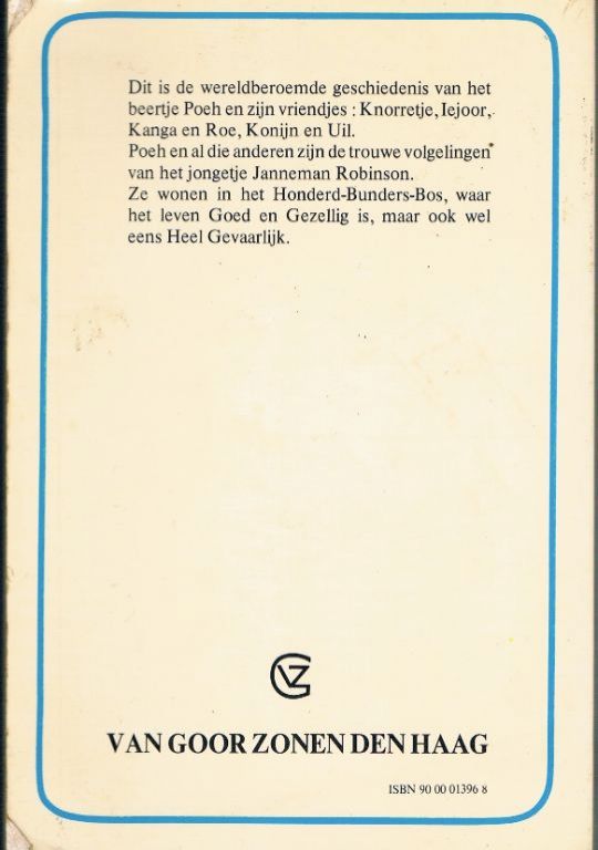 Uitg. van Goor. Veertiende druk. © 1973. Paperback. 135 pagina's. Illustraties door E,H, Shepard. Ik weet niet of het boek is gelezen, maar er is wel wat lichte slijtage. Dikte 1,5 cm. Gewicht 216 gram. Verzendkosten vanaf € 3,95. Prijs € 7,50.