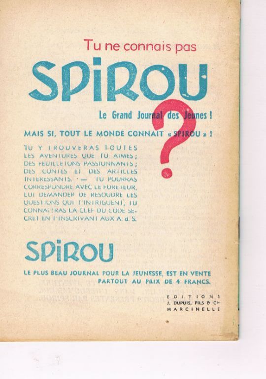 Uitg. Dupuis. Serie L'hebdomadaire des grands récits. Jaartal niet vermeld, maar ik taxeer dit omstreeks 1947 – 1950. Dit is nr. 52. Geniet boekje. Formaat 13,5 x 19,3 cm. 32 pagina's. Verlucht met een aantal tekeningen. Ongekleurd. Franstalig. Bedoeld voor de lezers van Spirou. Het is er kennelijk niet van gekomen deze boekjes ook in het Nederlands uit te brengen. Leuk, als u uw kennis van de Franse taal nog eens wilt ophalen met een spannend verhaal. Quasi nieuwstaat. Gewicht 26 gram. Verzendkosten vanaf € 2,02 zonder track & trace of € 3,95 met t & t. Voor dit relatief zeldzame boekje vraag ik € 9,50.