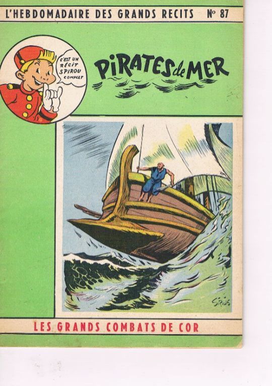 Uitg. Dupuis. Serie L'hebdomadaire des grands récits. Jaartal niet vermeld, maar ik taxeer dit omstreeks 1947 – 1950. Dit is nr. 87. Geniet boekje. Formaat 13,5 x 19,3 cm. 32 pagina's. Verlucht met een aantal tekeningen. Ongekleurd. Franstalig. Bedoeld voor de lezers van Spirou. Het is er kennelijk niet van gekomen deze boekjes ook in het Nederlands uit te brengen. Leuk, als u uw kennis van de Franse taal nog eens wilt ophalen met een spannend verhaal. Quasi nieuwstaat. Ik merk dat er van pagina 9-10 een hapje papier in de marge bovenaan is verdwenen. Dat hangt nu aan pagina 8 bovenaan. Kennelijk heeft de drukker destijds de bladzijden niet voldoende schoon gesneden. Dat was een slechte gewoonte in het verleden. Dan moest de koper met een mes in de weer om de bladzijden los te snijden. Ik zie ook nog een scheurtje van 1 cm in de marge onderaan op pagina 7-8. Ook nog een klein rafeltje op pagina 11-12 bovenaan. En nog een paar scheurtjes op de pagina's 15-20.
