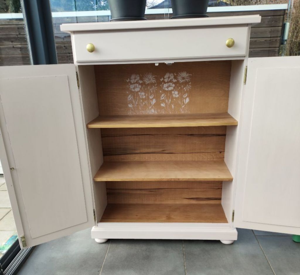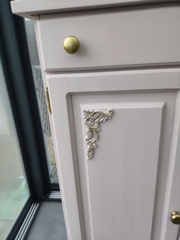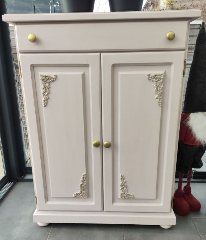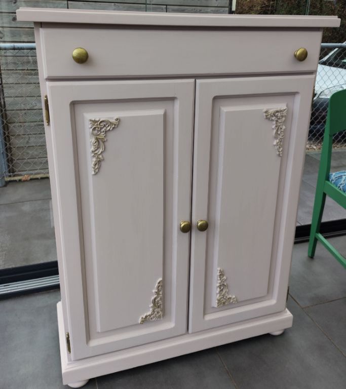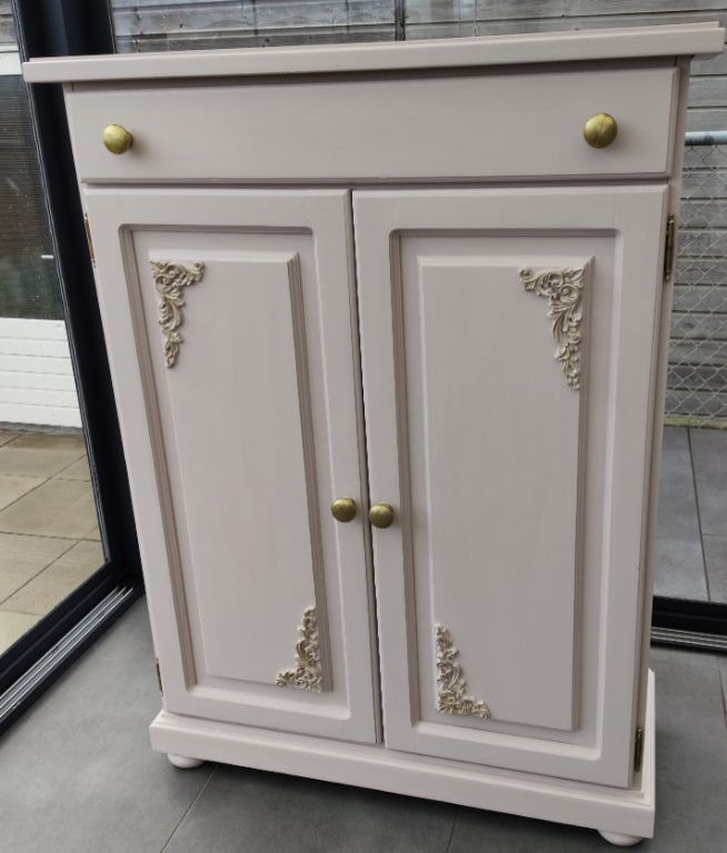 Zacht roze kast met ornamenten maten zijn 90 breed, 36 diep en 121 hoog.