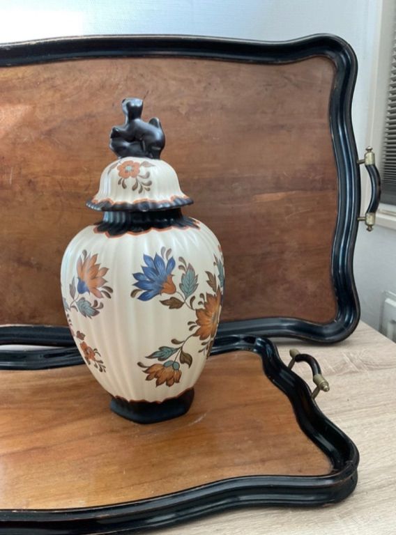 De totale hoogte is 33 cm (zonder deksel 23 cm ) en het breedst gemeten gedeelte is 16 cm
