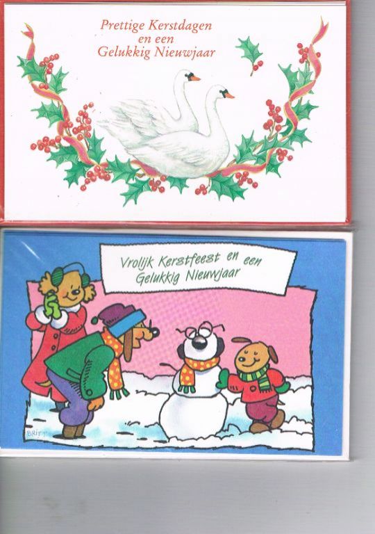 Scan 12: huizen met paard en wagen en mensen en tekst op groene achtergrond. Scan 13: 3 huizen met sterren op blauwe achtergrond en 2 huizen in de sneeuw met sparren. Scan 14: 2 witte zwanen en 3 personen met sneeuwpop.