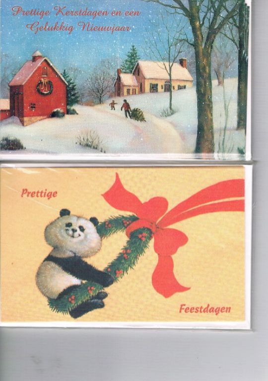Scan 1: groene versiering met rode ballen en 2 langwerpige kerststukjes. Scan 2: 3 x sparren met sneeuw en rode kaars met groen op achtergrond. Scan 3: witte kaars met ballen en rode strik. Scan 4: witte strik en mand met groen en paddenstoelen. Scan 5: witte zwaan en beestje met slee. Scan 6: rode ballen en mand met rode bloemen. Scan 7: hoofd van kerstman en 4 kerstmannen. Scan 8: 2 blauwe sparren en 1 groene spar. Scan 9: man sleept kerstboom en panda met kerstkrans. Scan 10: huis met 4 sparren en huis met slee. Scan 11: 2 huizen met lantaarn en vogel met gele borst.
