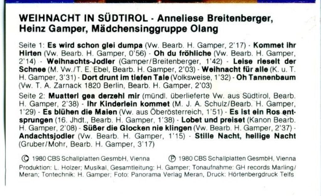 Anneliese Breitenberger Heinz Gamper - Weihnacht in Südtirol 16 nrs cassette 1980 ZGAN