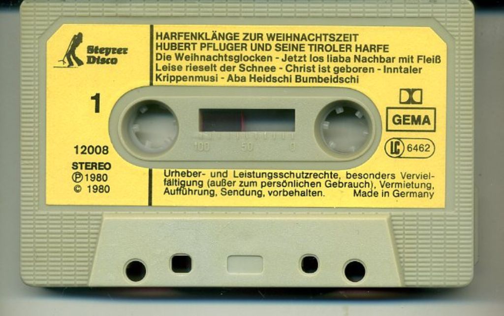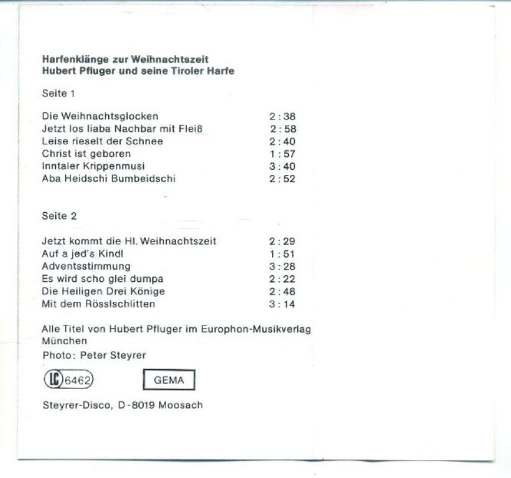 Hubert Pfluger – Harfenklänge Zur Weihnachtszeit 12 nrs cassette 1980 ZGAN
