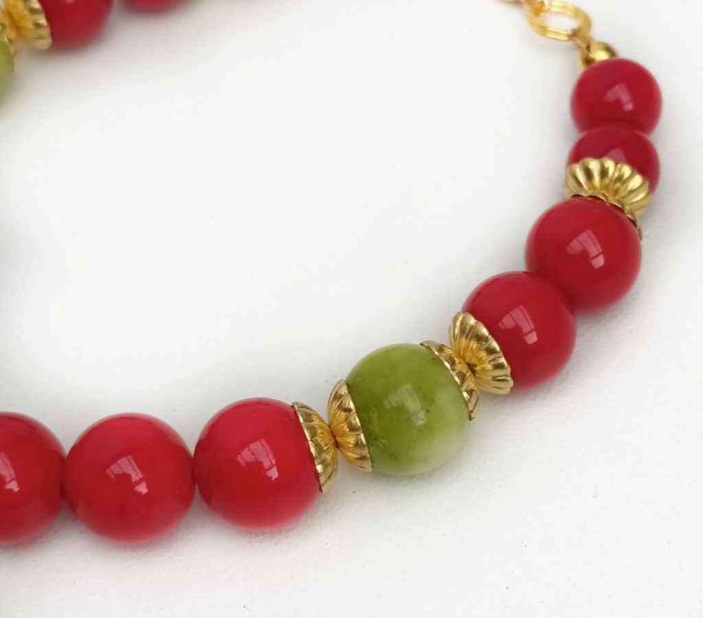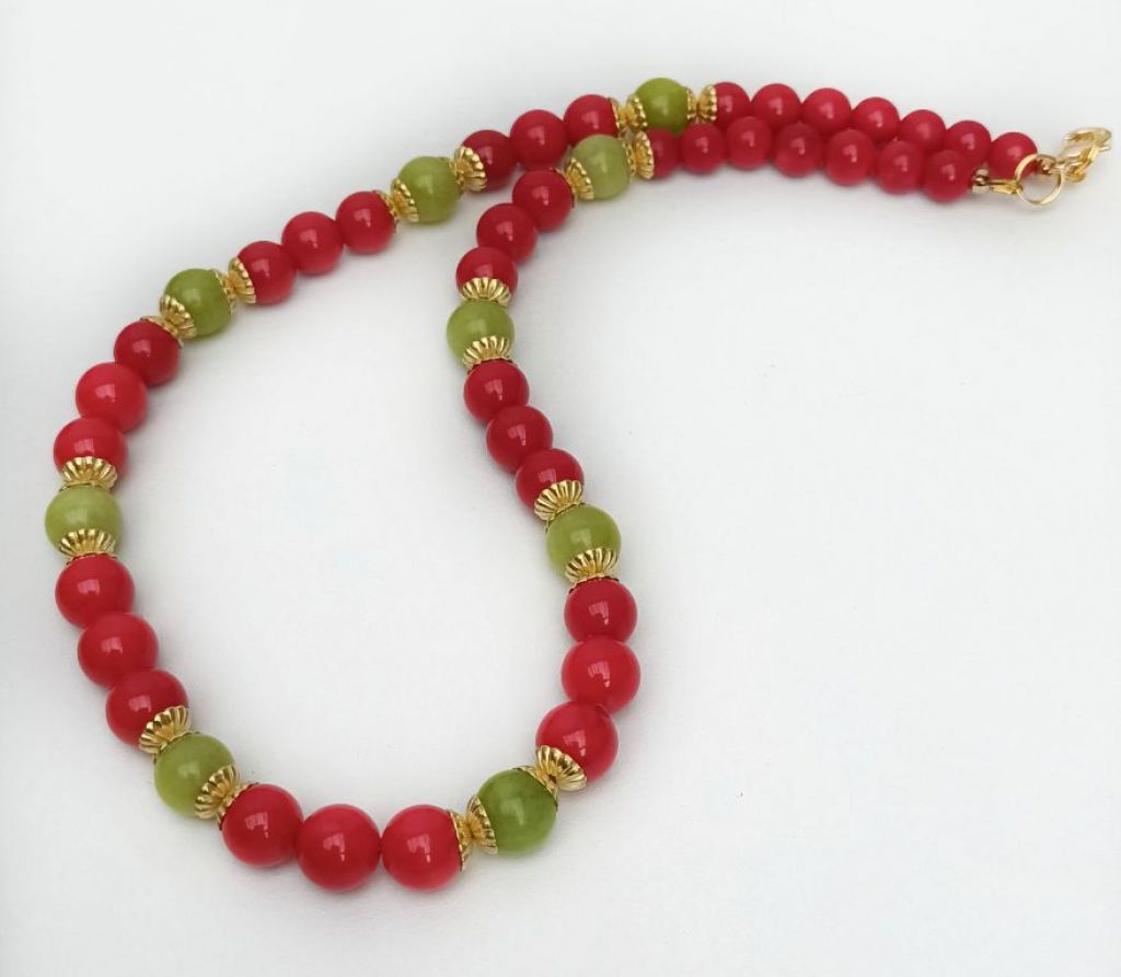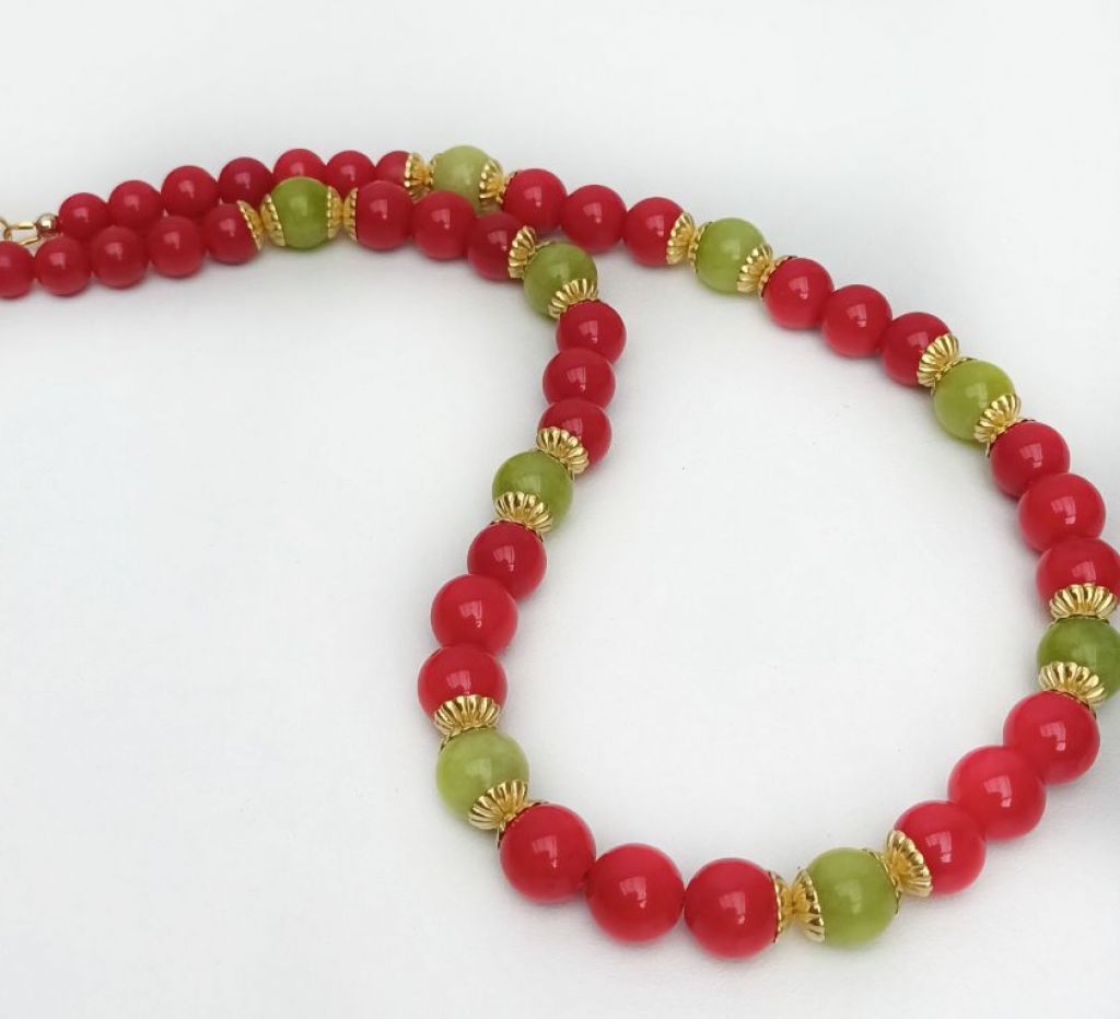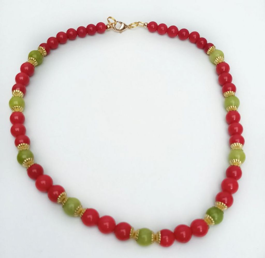 CORINA SIERADEN Ketting van maifaniet, matte unakiet en brons. Lengte: 56 cm.