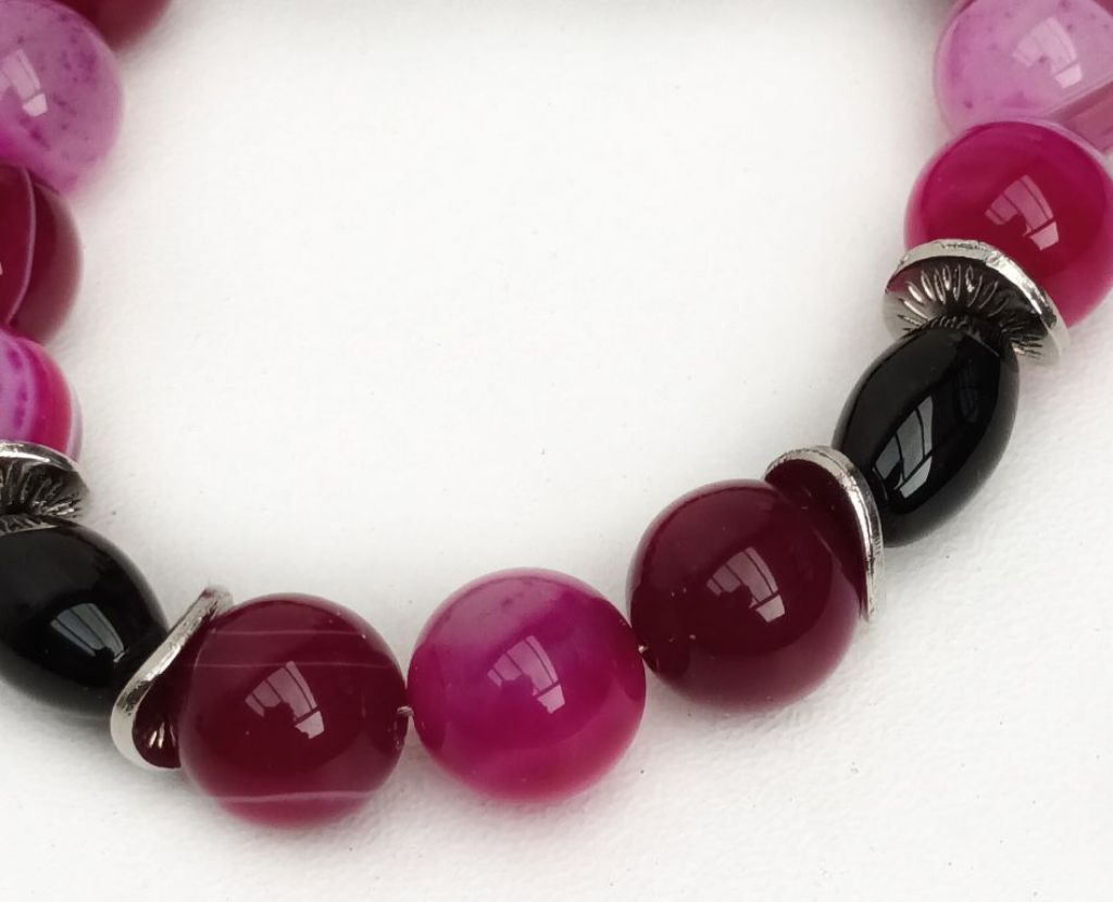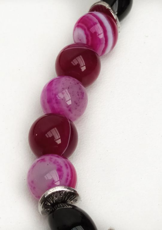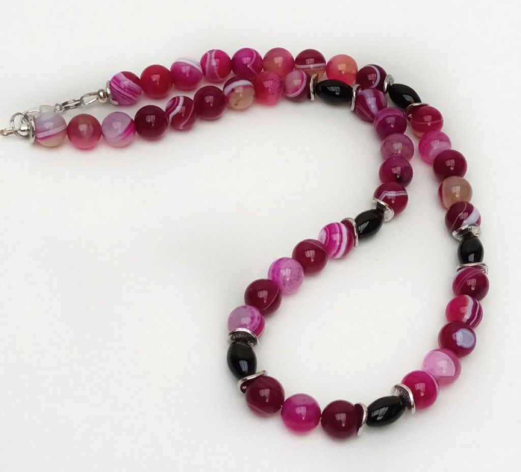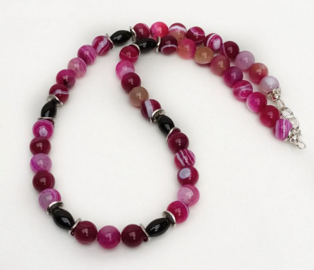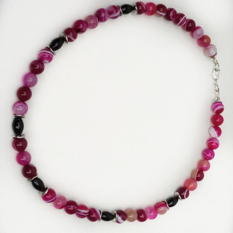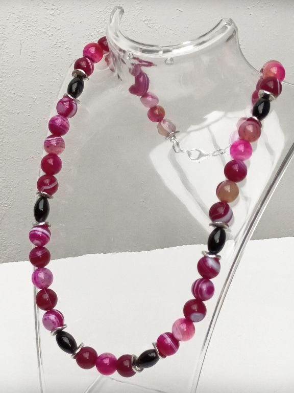Unieke ketting van sardonyx (10 mm), onyx (ovaal 8 x 12 mm) en zilverkleurige spacers.