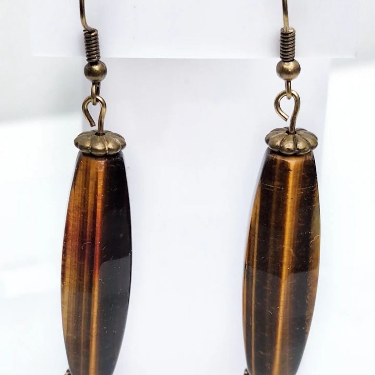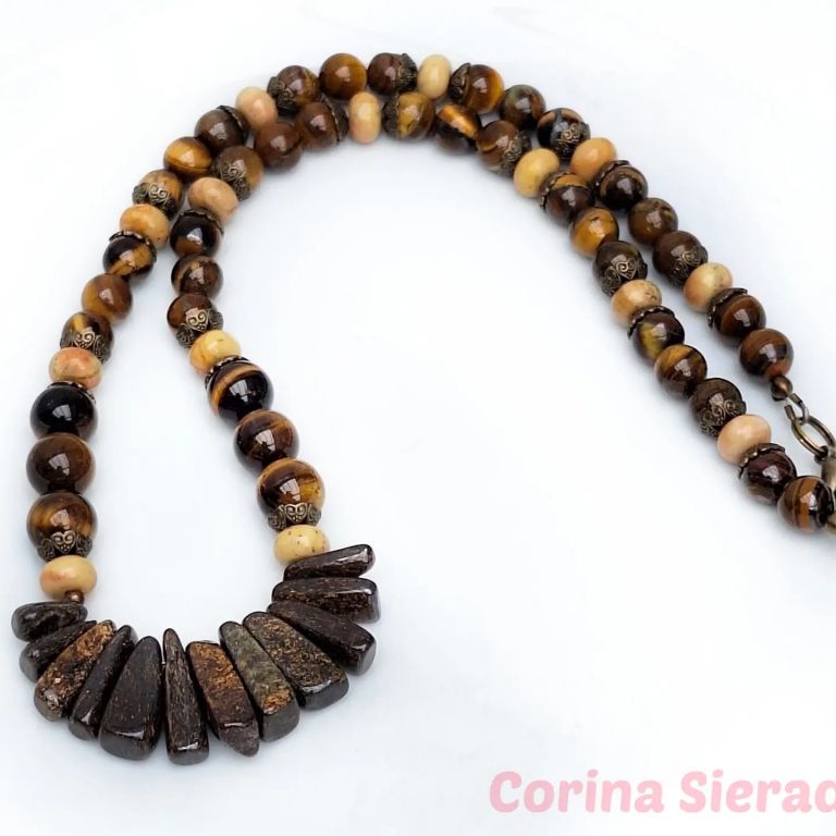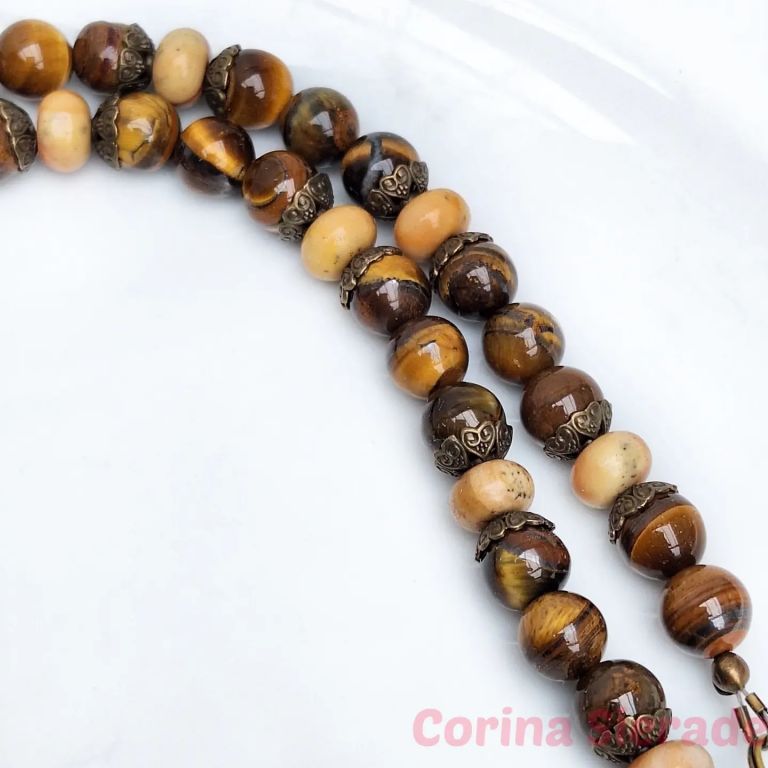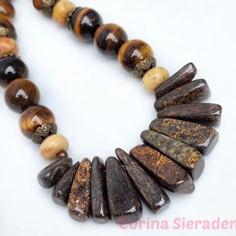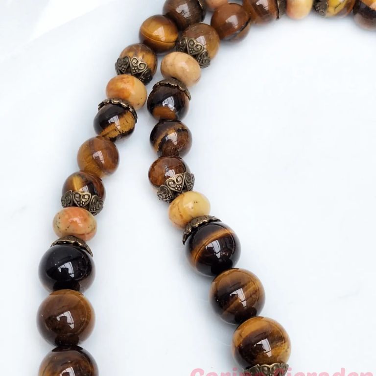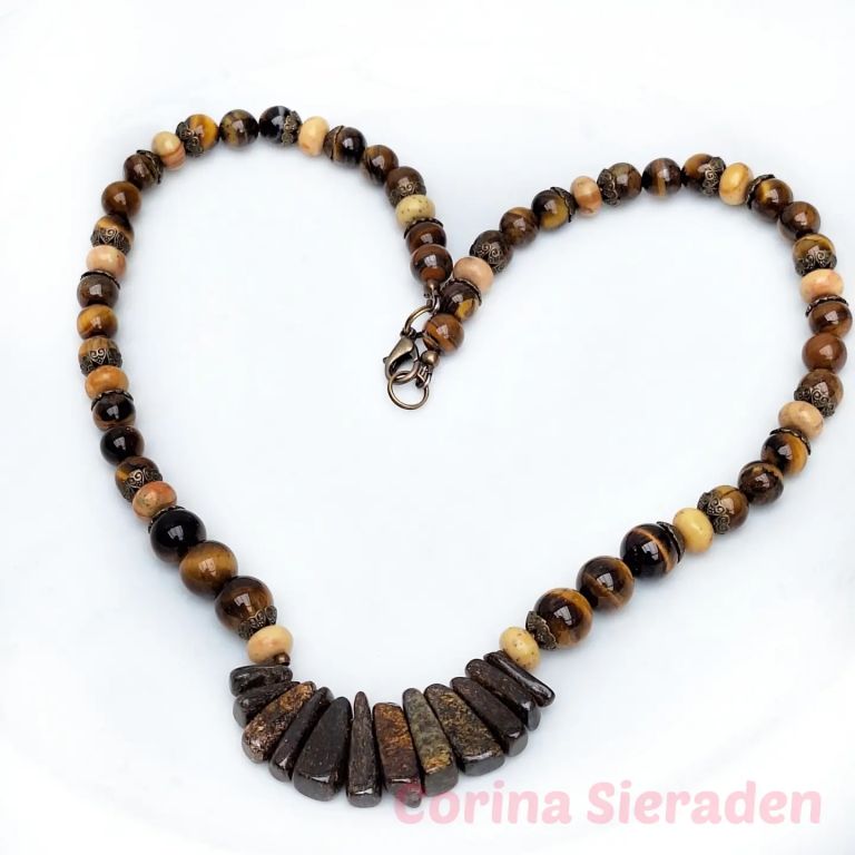 Ketting van tiger eye (8 en 10 mm), jaspis (rondelle) en brons.