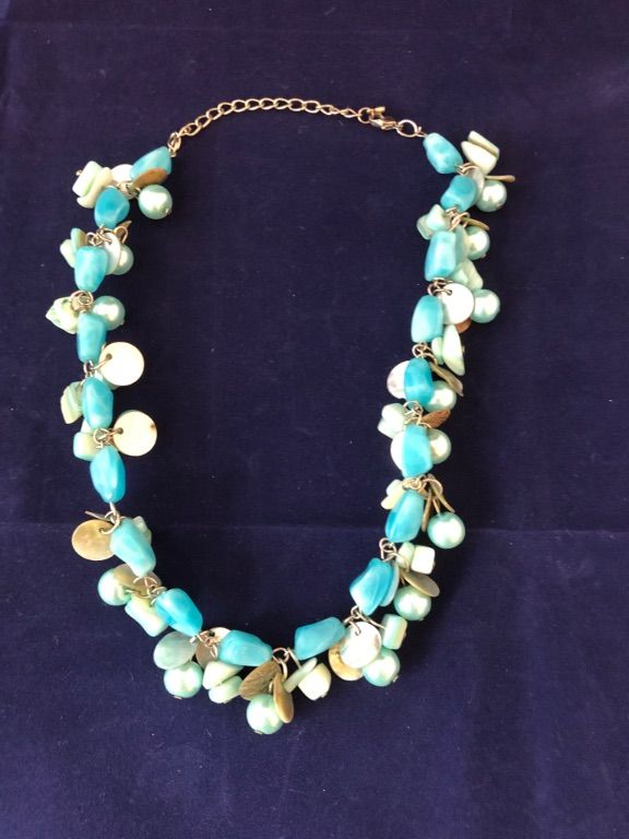 Een blauw groene halsketting met verzameling aan accessoires zoals kralen , stenen, ronde parelmoer plaatjes in een wederkerend stramien.
